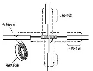 對(duì)導(dǎo)線的十字分支接頭進(jìn)行絕緣處理時(shí),包纏方向如圖22所示,走一個(gè)十字形的來回,使每根導(dǎo)線上都包纏兩層絕緣膠帶,每根導(dǎo)線也都應(yīng)包纏到完好絕緣層的兩倍膠帶寬度處。