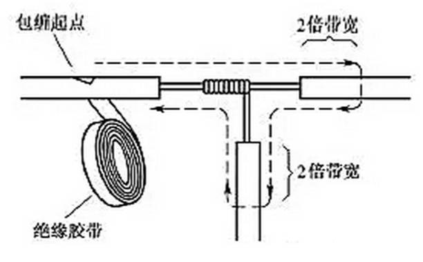 導(dǎo)線分支接頭的絕緣處理基本方法同上,T字分支接頭的包纏方向如圖21所示,走一個(gè)T字形的來回,使每根導(dǎo)線上都包纏兩層絕緣膠帶,每根導(dǎo)線都應(yīng)包纏到完好絕緣層的兩倍膠帶寬度處。