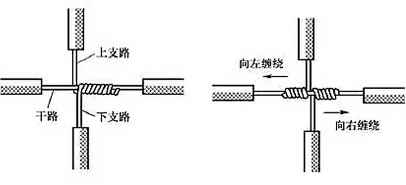 單股銅導(dǎo)線的十字分支連接如圖5所示,將上下支路芯線的線頭緊密纏繞在干路芯線上5~8圈后剪去多余線頭即可。可以將上下支路芯線的線頭向一個(gè)方向纏繞[見圖5(a)],也可以向左右兩個(gè)方向纏繞[見圖 5(b)]。