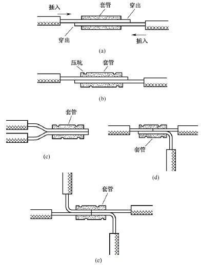 橢圓截面套管使用時(shí),將需要連接的兩根導(dǎo)線的芯線分別從左右兩端相對(duì)插入并穿出套管少許,如圖14(a)所示,然后壓緊套管即可,如圖14(b)所示。橢圓截面套管不僅可用于導(dǎo)線的直線壓接,而且可用于同一方向?qū)Ь€的壓接,如圖14(c)所示;還可用于導(dǎo)線的T字分支壓接或十字分支壓接,如圖14(d)和圖14(e)所示。