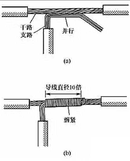 (4)多股銅導(dǎo)線的分支連接。多股銅導(dǎo)線的T字分支連接有兩種方法,一種方法是將支路芯線90°折彎后與干路芯線并行[見圖7(a)],然后將線頭折回并緊密纏繞在芯線上即可[見圖7(b)]。